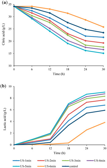 By increasing US duration treatment from 1 to 5 min, the concentrations of lactic acid significantly increased while the citric acid values decreased, compared to the control samples (p < 0.05). However, US treatment (6 min) markedly (p < 0.05) decreased the production of lactic acid and increased the citric acid values, compared to control samples. Regarding the citric acid (Figure 3a), the initial amount (34.2 g/L) reached 15.1 g/L, 25.8 g/L, and 23.5 g/L for US-5 min, US-6 min, and control samples, respectively, at the end of the fermentation period. The declining trend in the values of citric acid during fermentation can be attributed to lactic acid bacteria (LAB) metabolism [44]. In this line, some previous studies have shown that Lactobacillus species can use citric acid as an available carbon source to produce acetic acid, lactic acid, and diacetyl [34,35]. Similar results were reported for increased utilization of citric acid in US-treated apple juice compared to the unsonicated sample during fermentation [3]. After 30 h-fermentation with L. reuteri, the production of lactic acid reached 9.02 g/L and 3.83 g/L for US-5 min and US-6 min treatments, which were the highest and lowest levels of lactic acid production, respectively, compared to the unsonicated sample (5.91 g/L) (Figure 3b). The lower production of lactic acid and higher retention of citric acid can be related to the negative effect of long-term US treatment (6 min) on cell viability and microbial growth. In contrast, short treatments of US (1–5 min) increased the fermentation activity. These heterogeneous impact of US can be attributed to the role of electroporation on the cell membrane, in which short treatments increase the membrane permeability and metabolite exchange, while longer treatments compromise the cell structure and even cause cell rupture [45]. Similarly to our findings, Gholamhosseinpour and Hashemi [40] reported that increasing the duration of US treatment resulted in higher lactose hydrolysis and higher lactic acid production. In addition, it has been indicated that the application of 10 and 20 min US treatment during fermentation increased the lactic acid production from date syrup, while treatment of 30 min led to a decrease in lactic acid concentration [5].
