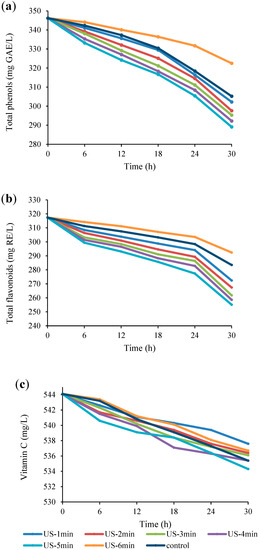 The changes of bioactive compounds including total phenolics, total flavonoids, and vitamin C in US-treated juice samples during fermentation are presented in Figure 4. As can be seen in Figure 4a,b, both total phenolics and total flavonoids significantly (p < 0.05) decreased with the elapse of fermentation time, and the highest and lowest reductions were observed in US-5 min and US-6 min samples, respectively, compared to the controls. There was no significant difference (p > 0.05) between the total phenolics and total flavonoids levels of the control, US-6 min, US-1 min, and US-2 min samples after 6 h of fermentation, but a significant difference was observed between all samples at the end of the fermentation period (p < 0.05). After 30 h of fermentation, 19.75%, 7.35%, and 13.43% reductions of total phenolics and 24.42%, 8.55%, and 11.96% reductions of total flavonoids were noticed in US-5 min, US-6 min, and control samples, respectively. Our results are in agreement with Hashemi et al. [24], who reported that fermentation of sweet lemon juice by L. plantarum LS5 resulted in an 8.28% reduction of total phenolic compounds. A similar decrease in total phenolic compounds and total flavonoid compounds was reported in olives, beans, and Saccharina japonica during fermentation [46,47,48]. It is speculated that the reduction in phenolic compounds may be related to their metabolism by starter microorganisms [46]. In addition, Adebo et al. [49] reported that notable losses of flavonoids may be related to the decomposition of phenolic compounds during fermentation. According to the findings, the increment in the losses of total phenols and flavonoids as a result of the US process (1 to 5 min) could be related to the increase in the activity of L. reuteri and the increase in the metabolism of phenolic compounds, whereas long-term US treatment (6 min) reduced the metabolism of these bioactive compounds due to the negative impact on cell growth. Similar results were reported by Wang et al. [3].