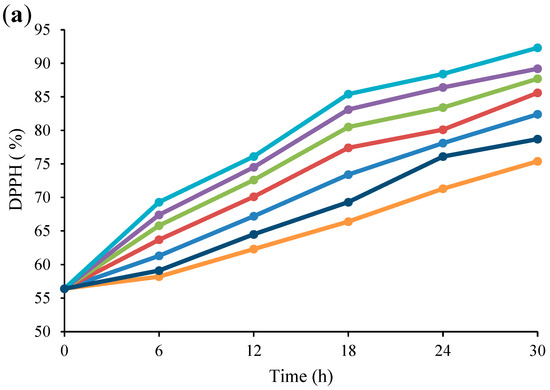 With respect to Figure 6b, data showed that the anti-inflammatory activity of juice samples significantly enhanced (p < 0.05) during the fermentation process. After 6 h of fermentation, insignificant difference (p > 0.05) was observed between the US-6 min, US-1 min, and control samples, while after 30 h of incubation, a significant difference (p < 0.05) was noticed between all the samples. The initial (11.3%) anti-inflammatory activity of Bakraei juices reached 33.4% and 19.5%, in the treatments of US-5 min and US-6 min, respectively, compared to the unsonicated juice (21.7%), after 30 h of fermentation. These findings are conform with the previous work, in which the fermentation of peach juice with L. fermentum and L. acidophilus resulted in increased anti-inflammatory activity [61]. This increase may be related to the production of some metabolites with anti-inflammatory potential, such as bacteriocins and natural acids, which are produced during fermentation with Lactobacillus species [62]. Furthermore, another study has shown that enhanced anti-inflammatory activity are associated with enhanced antioxidant activity in fermented pomegranate juice [63].