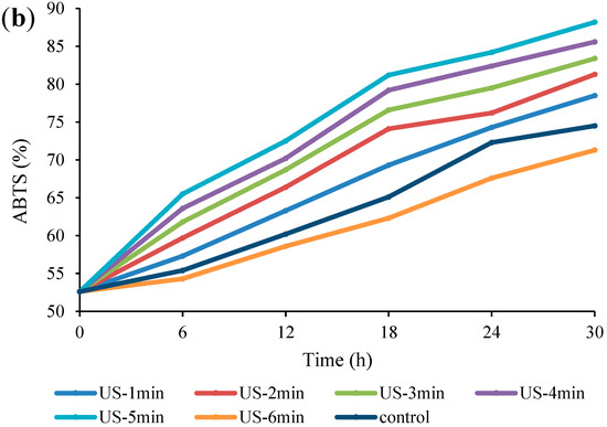 The effect of US on the antioxidant activities of fermented Bakraei juice samples is shown in Figure 5. As can be seen, there was a notable enhancement in the inhibition percentage by ABTS and DPPH when the US time was increased from 1 to 5 min, while the 6-min US treatment led to a decrease in the inhibition percentage compared to the unsonicated juice (p < 0.05). There was no significant difference (p > 0.05) between the ABTS and DPPH levels of the control and US-6 min samples in the first 6 h of treatment, but from 12th h onwards, a significant difference was observed between all samples (p < 0.05). With respect to Figure 5a, b, the amount of DPPH increased from 56.4% to 92.3%, 75.4%, and 78.7%, and the initial level of ABTS (52.6%) enhanced to 88.2%, 71.3%, and 74.5% in US-5 min, US-6 min, and control samples, respectively, at the end of the fermentation time. The obtained results coincide with the findings of Wang et al. [3], who indicated that US treatment during apple juice fermentation led to a decrease in total phenolic compounds, while the ABTS radical scavenging activity of treated juices increased. Moreover, it has been demonstrated that fermentation of mulberry juice by Lactobacillus species for 36 h increased the antioxidant activity [26]. It has been found that the antiradical activities of fermented foods depends on various factors such as fermentation time, pH, microbial strains, dissolved oxygen, temperature, etc. [52]. Kim et al. [53] stated that certain metabolites produced by starter strains during fermentation may have a notable effect on enhancing the antioxidant activity of soybean paste. Meanwhile, some bioactive compounds produced during fermentation, such as peptides, xylooligosaccharides, etc. can play an important role in increasing the antioxidant properties of the final product [54]. Similarly, LAB has been shown to have antioxidant capacity [55]. Hence, in US-6 min treatment, lower number of viable cells resulted in less production of bioactive compounds and less antioxidant activity.