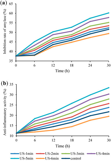 The influence of US process on some biological properties of fermented Bakraei juice samples including α-amylase inhibition and anti-inflammatory activity was also evaluated. Figure 6a, shows the variations in anti-hyperglycemic properties of juice samples throughout the fermentation period. Accordingly, the inhibition of α-amylase significantly (p < 0.05) increased during the fermentation time. In addition, US-5 min and US-6 min showed the highest and lowest inhibition rate of α-amylase, respectively. Similarly, Peláez-Acero et al. [56] showed that the highest inhibition of α-amylase was at 20 min, while as the US duration increased to 30 min, the enzyme inhibition significantly decreased in honey samples. This could be related to the positive effect of US on cell growth and production of functional compounds to inhibit α-amylase activity, whilst longer application of US possessed a negative effect on cell viability and growth due to the cavitation phenomenon [57]. Moreover, Gholamhosseinpour et al. [58] indicated that α-amylaseinhibition was higher in fermented milks treated with US and microwave compared to other processing including autoclave, microwave and US + autoclave. They also reported an increase in enzyme inhibition with fermentation time. Bioactive exopolysaccharides secreted by LAB and production of bioactive peptides during lactic acid fermentation have been considered as the main factors of α-amylase inhibition [59,60].
