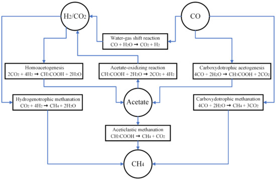 The major pathways of syngas biomethanation have been well summarized in previous studies, as shown in Figure 1 [20,21,22]. Generally speaking, syngas biomethanation under a thermophilic condition has higher efficiency of CH4 production and less byproducts, such as VFAs, in comparison to a mesophilic condition, and has a high potential for industrial application [10,23]. For mesophilic syngas biomethanation, more abundant microbial communities and more complex metabolic pathways exist, leading to the production of more VFAs (mainly acetate) as intermediate products [13,22,24].