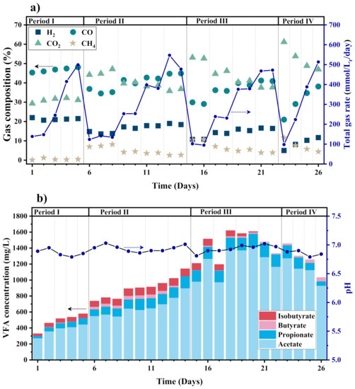Except for Period I without mixing, the total outlet gas flow rate and the gas composition in the other periods show a clear relationship with the GRT. With decreasing GRT, the H2 and CO concentrations increase gradually, while the CH4 and CO2 concentrations decrease, as seen in Figure 3a. In fact, CO2 should also be the substrate for biomethanation if H2 is sufficiently high. However, when limited by the reduction equivalent content and the biomethanation capacity of the reactor, CO2 tends to be regarded as the product due to CO water–gas shift reaction. Figure 3b shows that VFAs increase in the early stages and finally stabilize at about 1200 mg/L in Periods III and IV.