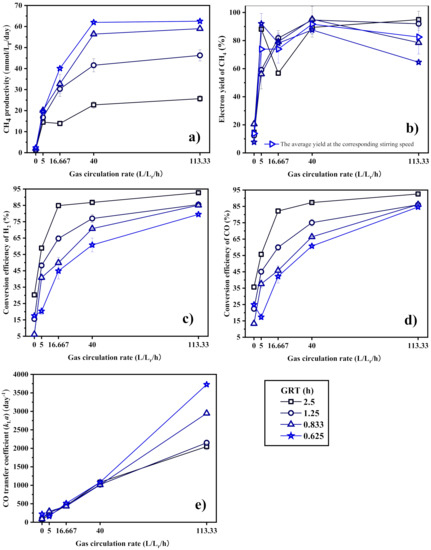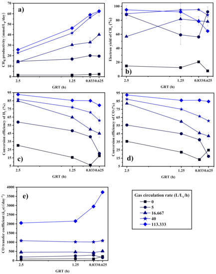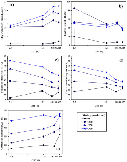 (a) CH4 productivity, (b) electron yield to CH4, conversion efficiency of (c) H2 and (d) CO, and (e) CO transfer coefficient (kLa) of the CSTR at different GRTs.