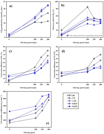 (a) CH4 productivity, (b) electron yield to CH4, conversion efficiency of (c) H2 and (d) CO, and (e) CO transfer coefficient (kLa) of the CSTR as a function of the stirring speed.