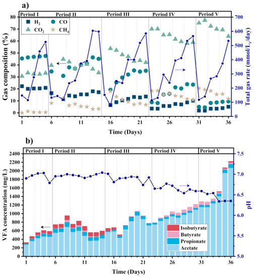 (a) Composition and rate of output gas, and (b) VFA concentration and pH in the BCR-C during syngas biomethanation (The whole test time is divided by 5 periods with different gas recirculation rates, and each period is divided by dotted lines with different GRT of 2.5, 1.25, 0.833, and 0.625 h from left to right).