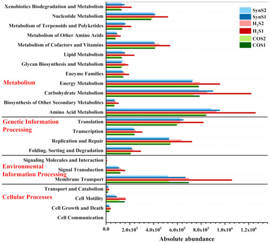 Absolute abundance of KEGG function classification at Level 2 under the start-up stage and the normal operation stage. (S1: Stage 1 for reactor start-up operation; S2: Stage 2 for normal reactor operation. CO: the test run was started up by feeding with 50% CO + 50% N2. H2: the test run was started up by feeding with 50% H2 + 12.5% CO2 + 37.5% N2. Syn: the test run was started up by feeding with 20% H2 + 50% CO + 30% CO2.).