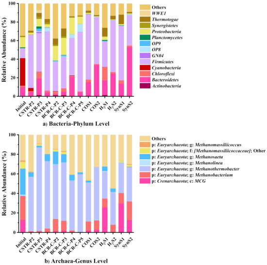 Figure 10 shows the community relative abundance of Bacteria at the phylum level and Archaea at the genus level. Under a thermophilic condition, the community composition is simpler than that under a mesophilic condition, because a high temperature is not suitable for the growth of many microorganisms [22]. As shown in Figure 10, the temperature is the major factor shifting the dominant communities for both Bacteria and Archaea. The initial inocula are obtained in a mesophilic industrial bioreactor, and its microbial communities are different from those in the thermophilic reactors of this experiment. The microbial communities are similar to each other in the thermophilic reactors at all periods.
