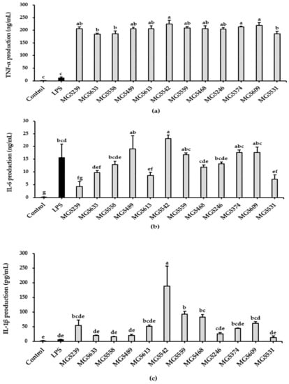 Pro-inflammatory cytokines secreted by macrophages, such as TNF-α, IL-6, and IL-1β, induce the early defense of the organism and activate the Th1 response [24]. Based on these results, the five most promising strains, L. fermentum MG5489, Lc. lactis MG5542, L. paracasei MG5559, L. sakei MG5468, and L. curvatus MG5609 were selected, and additional studies were carried out using these strains.