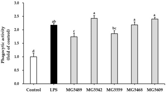 Effect of the selected strains on the phagocytosis of RAW264.7 cells. Phagocytosis was evaluated using the neutral red uptake assay and was quantified by measuring the logarithmic intensity using a microplate reader. Results were expressed as phagocytic activity relative to untreated cells. Data are presented as mean ± SD of three independent experiments (n = 3). Different letters on the column indicate significant differences between means at p < 0.05 based on Tukey’s post hoc test.