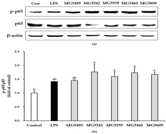 Effect of the selected strains on NF-κB activation in RAW264.7 cells. Western blots (a) and phosphorylation levels of p65 (b). The phosphorylation levels of p65 were expressed as fold changes of control. Data are presented as mean ± SD of three independent experiments (n = 3). Different letters on the column indicate significant differences between means at p < 0.05 based on Tukey’s post hoc test.