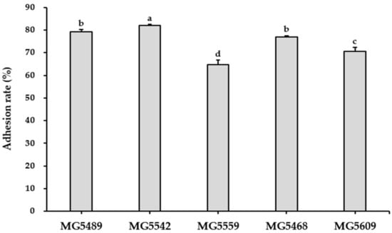 The adhesion abilities of the selected strains were assessed using HT-29 cells (Figure 4). The results revealed that the adhesion rate of the selected strains ranged from 64.82–82.04%. Among the strains studied, Lc. lactis MG5542 (82.04 ± 0.38%) showed the highest adhesion rate.