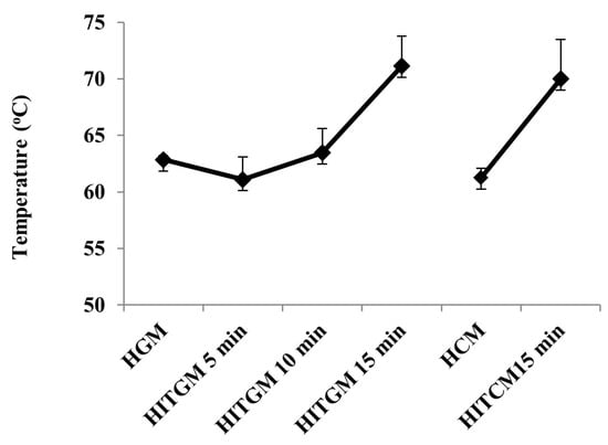 Changes in the temperature of goat and cow milk samples during the high-intensity thermosonication treatment. Values presented as means of triplicate ± standard deviation. HGM, homogenized goat milk; HITGM 5 min, goat milk, high-intensity thermosonicated for 5 min; HITGM 10 min, goat milk, high-intensity thermosonicated for 10 min; HITGM 15 min, goat milk, high-intensity thermosonicated for 15 min; HCM, homogenized cow milk; HITCM 15 min, cow milk, high-intensity thermosonicated for 15 min.