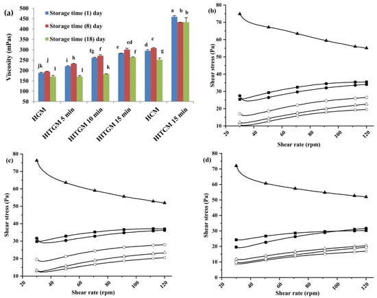 The changes in the viscosity during the storage (a) and shear stress of the stirred yoghurt samples during storage for 1 day (b), 8 days (c) and 18 days (d). The symbols represent