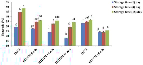 Syneresis of the stirred yoghurt samples during storage. HGM, homogenized goat milk; HITGM 5 min, goat milk, high-intensity thermosonicated for 5 min; HITGM 10 min, goat milk, high-intensity thermosonicated for 10 min; HITGM 15 min, goat milk, high-intensity thermosonicated for 15 min; HCM, homogenized cow milk; HITCM 15 min, cow milk, high-intensity thermosonicated for 15 min. Data points not connected by the same letter are significantly different from each other (p < 0.05).
