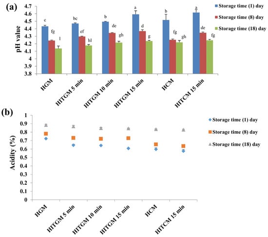 The pH levels of the stirred yoghurt samples during the storage periods (1, 8 and 18 days) are shown in Figure 4a. The highest decrease rate in pH was determined in the samples produced from the homogenized samples. The pH of the stirred yoghurt samples ranged from 4.43 to 4.58 on the first day and decreased during storage from 4.13 to 4.24 at the end of the storage time. While the HIT had a significant (p < 0.05) effect on the pH of the stirred yoghurt, it also had a significant (p < 0.05) effect on the acidity.