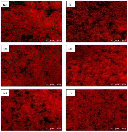 The visualization of the microstructure of the stirred yoghurt samples was observed by CLSM according to Andoyo et al. []. The samples were stained by rhodamine B isothiocyanate (RITC) solution (85 g L−1 RITC in dimethyl sulfoxide, Sigma Aldrich, St Quentin Fallavier, France) at 0.2 g kg−1. Then the samples were examined using a Leica TCS SP8 confocal laser scanning microscope (Leica Microsystems, Wetzlar, Germany) and observed through helium–neon laser (excitation at 543 nm and emission at 625 nm). The images were digitalized in grey level as 512 × 512 pixels matrix.