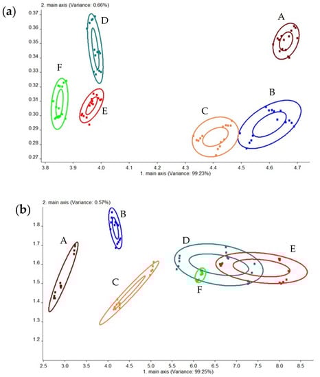 Principal component analysis (PCA) based on electronic nose data produced by different stirred yoghurt samples of the homogenized goat milk (A), goat milk, high-intensity thermosonicated for 5 min (B), 10 min (C), 15 min (D), homogenized cow milk (E) and cow milk, high-intensity thermosonicated for 15 min (F) on the first day (a) and on the 18th day (b).