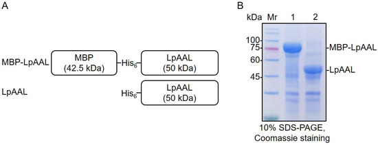 Preparation of recombinant MBP-LpAAL and LpAAL proteins. (A) LpAAL protein and MBP-LpAAL fusion protein were expressed in Escherichia coli. (B) Recombinant proteins were purified using Ni-NTA affinity column and separated using 10% SDS–PAGE, and then stained with Coomassie Blue dye. Mr, molecular weight SDS–PAGE marker; lane 1, MBP-LpAAL; lane 2, LpAAL. MBP: maltose-binding protein.