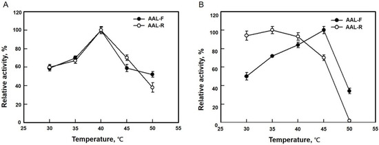 Optimum reaction temperature of AAL-F and AAL-R activities of LpAAL (A) and MBP-LpAAL (B) enzymes. Activities were measured under standard assay conditions in a range of temperatures from 30 to 50 °C. All experiments were performed in triplicate and expressed as average ± standard deviation (S.D., error bars). The average of maximum activity was normalized as 100%.