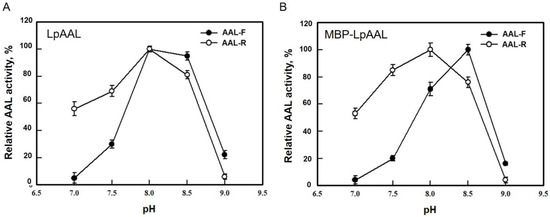 Normally, AAL enzymes are used to react in alkaline conditions, where the optimum pH is between 7.0 and 9.0 [23]. The optimal pH of the AAL enzyme purified from Escherichia coli and Pseudomonas aeruginosa were 8.0 and 8.5, respectively [11,21]. Our result showed that the optimal reaction pH of both AAL-F and AAL-R activities of LpAAL enzyme was 8.0 (Figure 4A), while the optimal pHs of AAL-F and AAL-R activities of MBP-LpAAL enzyme were 8.5 and 8.0, respectively (Figure 4B). As a result, the optimal reaction pH of LpAAL and MBP-LpAAL proteins was comparable with other microbial AAL proteins.