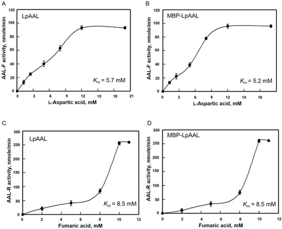 The kinetics parameters of the LpAAL and MBP-LpAAL enzymes were studied and the Km values of the enzymes were calculated using saturation curves (Figure 5) and the Michaelis–Menten equation. After calculation, the result showed that the Km values of LpAAL and MBP-LpAAL proteins using aspartic acid as a substrate were 5.7 (Figure 5A) and 5.2 mM (Figure 5B) at pH 8.0, respectively, and were similar to that of Pseudomonas fluorescens AAL (Km = 5.1 mM) [21]. The Km values of LpAAL and MBP-LpAAL proteins using fumaric acid as a substrate were both 8.50 mM at pH 8.0 (Figure 5C,D), which is significantly different from the study showing the Km value of the Pseudomonas aeruginosa AAL enzyme using fumaric acid as a substrate to be 21,234 mM [11].