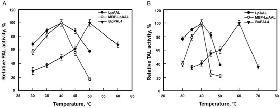 Recently, Patel et al. reported that Pseudomonas aeruginosa AAL protein can utilize phenylalanine as a substrate to yield cinnamic acid [11]. To investigate whether LpAAL/MBP-LpAAL proteins can also use L-phenylalanine or can further use L-tyrosine as a substrate, the optimum temperature of PAL and TAL activities were determined to between 30~50 °C. The optimal PAL and TAL activities of LpAAL protein were both at 40 °C (Figure 6A), similar to the optimal temperature of MBP-LpAAL (Figure 6B). However, the optimal temperatures of BoPAL4 protein for PAL (50 °C) and TAL activities (60 °C) were significantly higher than that of LpAAL and MBP-LpAAL proteins (Figure 6A,B).