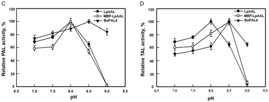 Accordingly, the optimum pH for PAL and TAL activities were determined between 7.0 and 9.0, and the optimum pH for PAL and TAL activities of LpAAL protein were both 8.0 (Figure 6C), which is similar to the optimum pH for MBP-LpAAL protein (Figure 6D). In addition, the optimum pH of BoPAL4 protein for both PAL and TAL activities was 8.5, which was comparable with that of LpAAL and MBP-LpAAL proteins (Figure 6C,D). LpAAL and MBP-LpAAL proteins exhibited better PAL/TAL relative activities at lower temperature and pH than that of BoPAL4 protein. Taken together, LpAAL and MBP-LpAAL proteins were able to produce cinnamic acid and p-coumaric acid through their PAL and TAL activities.