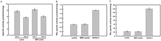 Comparison of specific activities in LpAAL, MBP-LpAAL, and BoPAL4. (A) Specific AAL-F and AAL-R activities in LpAAL and MBP-LpAAL were measured under standard assay condition. (B) Specific PAL activities in LpAAL, MBP-LpAAL and BoPAL4 were measured under standard assay condition. (C) Specific TAL activities in LpAAL, MBP-LpAAL and BoPAL4 were measured under standard assay condition. All experiments were performed in triplicate and expressed as average ± standard deviation (S.D., error bars).