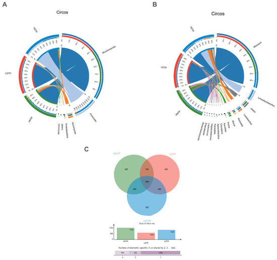 Figure 1. The Circos microbial composition of Tianpei samples with NR annotation. (A) At the phylum level and (B) at the genus level. (C) A Venn diagram illustrating shared and unique species among three Tianpei samples.