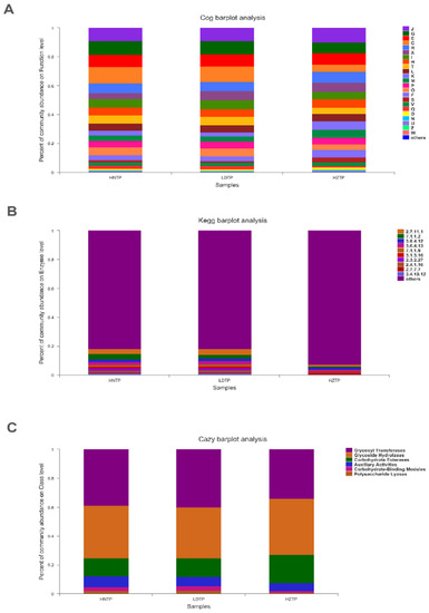 Figure 2. Microbial functional annotation and compositions of Tianpei samples. (A) COG analysis, (B) KEGG analysis-enzyme, and (C) CAZy analysis.