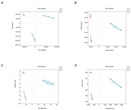 Figure 3. PCA of Tianpei samples: (A) PCA of NR; (B) PCA of COG; (C) PCA of KEGG; (D) PCA of CAZy.