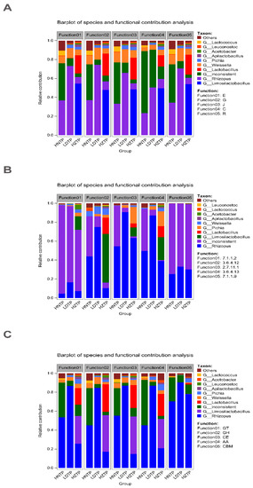 Figure 4. Taxa and function contribution analysis of Tianpei samples: (A) taxa and COG contribution, (B) taxa and KEGG contribution, (C) taxa and CAZy contribution.