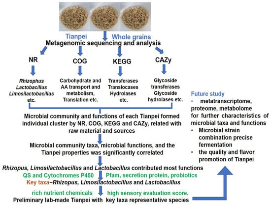 Based on the metagenomic analysis, with the microbial taxa of the most abundant functions, Tianpei samples were fermented and preliminarily made in the library with the representative microbial strains Rhizophus oryzae, Lactobacillus plantarum, and Limosilactobacillus fermentum. The lab made Tianpei obtained a rich abundance of nutrient chemicals. Considering the safety aspects of traditional fermented food, we also tested the Escherich coli, Staphylococcus aureus, and mounds in the Tianpei samples in a later study, and they were all within the standard range. The study tried to precisely find and combine the microbial strains to make fermented whole food, to some degree, according to the metagenomic analysis. With the further analysis of metatranscriptome, proteome, metabolome, etc., characteristics of microbial taxa and their functions could be better achieved. The microbial strain combinations and precise fermentation, and the quality and flavor promotion of Tianpei, could be further investigated and improved. The research ideas, process, main results, and future study is summarized in Figure 5.