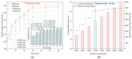 Disperser disintegration was performed by varying the disperser rpm and time to gauge the SOR. Disperser-assisted cell wall cleavage works on three major mechanisms: firstly, via cavitation; secondly, via the generation of hydroxyl radical; and, thirdly, via the shear force generation [5]. The first mechanism occurs via the generation of microbubbles during dispersion, which leads to cavitation. Secondly, the cavitation generates hydroxyl radicals in liquid phase due to the hemolytic splitting of hydrogen bonds. These generated radicals interact with the cells of the sludge biomass to release the intracellular components to the aqueous phase. In the third mechanism, the shear force produced due to the circumferential speed and space between the rotor and the stator cleaves the cell wall of the sludge biomass and augments the soluble organics [18]. Thus, the combination of these three mechanisms encourages solubilization and solid reduction by loosening the internal region of the biomass and, thus, enhancing the surface area of the biomass structure. Figure 2a depicts the effects of disperser rpm and time on SOR and solubilization. It is evident from the figure that SOR increases with an increase in time till 30 min for all the rpm ranging from 6000 to 20,000. Beyond 30 min, a steady release is noted at all disperser rpm. For example, at 6000 rpm, SOR increases from 100 to 160 mg/L, while increasing the time from 0 to 30 min. With further increase in the time from 45 to 60 min, the release is observed to be 161–163 mg/L, which shows a steady release. Likewise, a similar trend of release was obtained at all disperser rpm. This trend of release is similar to Sethupathy et al. [18], where the surfactant-coupled disperser pretreatment method was adopted to pretreat the sludge. Thus, the results show that the maximum SOR is assumed to be released at 30 min and is considered to be optimal.