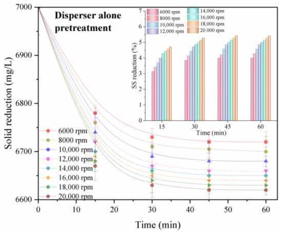Suspended solid (SS) is an index to evaluate the stability of sludge by examining the variation in solid changes during disperser disintegration. Figure 3 depicts the impact of the disperser pretreatment time and rpm on SS reduction. The trend shown on the SS reduction graph is analogous to that of solubilization. From the figure, it is noticed that the SS reduction also follows two phases, namely a rapid reduction phase from 0 to 30 min and a slow stabilization phase from 45 to 60 min at all disperser rpm. For instance, at 6000 rpm, the rapid reduction phase was found to be between 0 and 30 min with a SS reduction percentage between 0 and 3.85%, whereas the stabilization phase was found to be from 45 to 60 min with a percentage of 3.85–4%. A similar trend at all the rpm shows that 30 min is optimum for SS reduction