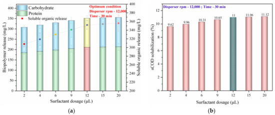 Effect of the surfactant-coupled disperser pretreatment on (a) soluble organic release and biopolymer, and on (b) solubilization.