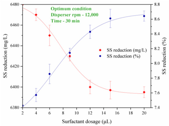 Figure 5 depicts the effect of the surfactant-coupled disperser pretreatment on suspended solid reduction. The APG dosage was varied from 2 to 20 μL at the optimum disperser condition of 12,000 rpm and 30 min. With an increase in the concentration of the surfactant from 2 μL to 12 μL, there is a change in solids, with the SS reduction from 6480 to 6400 mg/L and the reduction efficiency between 7.43 and 8.43%. This reduction may be due to the synergetic effect of the combined pretreatment, which leads to a compression in the sludge surface, causing the disintegration of the biomass and, thus, resulting in the release of intracellular components to the soluble phase. Beyond 12 μL, there is no remarkable reduction in SS and the reduction efficiency is found to be 8.61–8.64%, when the APG dosage increases from 15 μL to 20 μL. A similar trend was observed by Ushani et al. [23] when dioctyl sodium sulphosuccinate was used as the surfactant and coupled with a sonic pretreatment for the disintegration of waste-activated sludge.