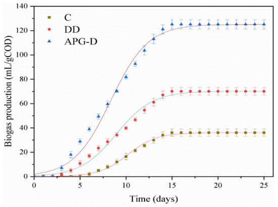 Figure 6 depicts the biogas production for the control (C) sample, the disperser-alone (DD) pretreated sample, and the alkyl polyglycoside-induced disperser (APG-D) pretreated sludge sample. Biogas production is lower at the beginning and steady at the end of the digestion, similar to previous findings [24]. The trend of the graph is distinguished into three phases—a lag phase, a log phase, and a stationary phase [10]. The biogas production on the 6th day is noted to be 2, 17, and 39 mL/gCOD in the C, DD, and APG-D samples. This lower biogas production is due to the adaptation of anaerobic bacteria to their new habitat [23]. Beyond the 6th day, biogas production increases in all the samples till the 15th day. In the case of the control, the maximum biogas production of 36.1 mL/gCOD was achieved on the 15th day. This lower release might be due to the presence of an extracellular layer and tough cell wall, which restricts the activity of methanogens on organic matters. In the DD and APG-D samples, biogas production was found to be 70.1 and 125.1 mL/gCOD, respectively, on the 15th day. Elevated gas generation in the APG-D pretreated sample might be due to the reduction in surface tension of the particles by the surfactant and, subsequently, the disperser pretreatment enhances the surface area for anaerobic microbial action, thus showing a rapid hydrolysis of the sludge biomass. Thus, the synergic action between the surfactant and the sonic pretreatment enhances biogas production [5]. The upsurge in biogas generation is analogous to the study conducted by [23,25]. As expected, biogas production was found to be low in the control compared to the pretreated samples. This might be due to the rate-limiting hydrolysis step during AD and the reduced availability of substrates to microorganisms for biogas production [10]. In a study by Zhao et al. [13], the presence of APG shows an inhibitory effect on methanogenic bacteria by rupturing the cell membrane of methanogens. In the present study, the coupling of a lower dosage of APG with a disperser enhances biogas production. Beyond 15 days, the release becomes stable due to the complete exploitation of substrate and the beginning of endogenous respiration of microbes. The R2 value is in the range between 0.994 and 0.997 in all the samples; thus, the logistic model shows goodness of fit with the experimental values These results indicate that the AGP-D pretreated sample shows better biogas production compared to the DD and the C samples. A limitation of the present study is the interference of recalcitrant lignocellulosic matters present in the substrate with the disperser pretreatment, which affects disintegration efficiency. Although the APG is efficient in dissolving sludge and the coupling of APG with a disperser is efficient in disintegrating organic matters to the soluble phase, the disintegration efficiency is low. It can be enhanced by the co-digestion of PMS with other waste feedstock, which eventually increases the organic content and, thus, helps in enhancing disintegration and solubilization [26]. The productivity in AD can be enhanced by adopting a two-stage digester.