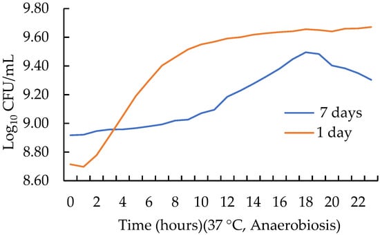 The effect of age on the kinetic parameters of L. acidophilus is shown in Table 1 and in the growth curve in Figure 2. All kinetic parameters were different among the two cultures (p < 0.05). The initial point of the sigmoidal curve (yo) was greater (p < 0.05) for the old culture, 8.95 ± 0.005, compared to 8.71 ± 0.044 of the young culture. The lag phase was seven times greater (p < 0.05) in the old culture than in the young one, 7.198 ± 0.355 vs. 1.001 ± 0.091, respectively. The rate (µmax) was more than twice as small (p < 0.05) for the old culture, 0.047 ± 0.001, vs. 0.108 ± 0.006, respectively. The time to reach the end of the sigmoidal curve (Tmax) was greater (p < 0.05) for the old culture (16.87 ± 0.120) compared to the young one (9.42 ± 0.042). Finally, regarding the regression adjustment coefficient (R2), the trilinear model adjusted well since the regression coefficients were greater than 0.95.
