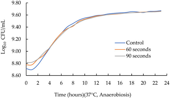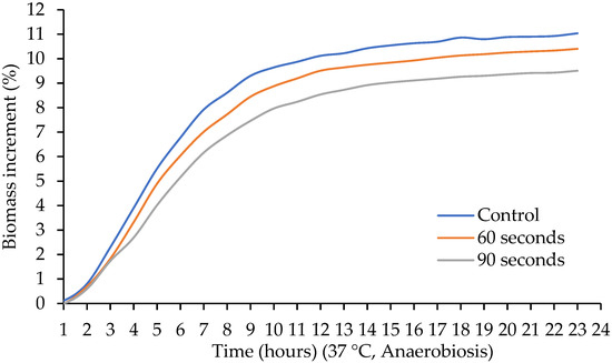 Tabatabaie and Mortazavi (2008) [25] studied the effect of time (5, 10, 15, 20, 25, and 30 min) of ultrasonic treatments (20 kHz, 80% amplitude) on Lactobacillus spp., finding that the application of ultrasound at any time decreased the viability of Lactobacillus spp. In this study, lower biomass production was found when ultrasound was applied for 60 and 90 s (Figure 4). Likewise, Wang and Sakakibara (1997) [26] studied the application of ultrasound (200 kHz) in four strains of Lactobacillus, reporting a decrease or maintenance in the viability of the strains. Therefore, the application of ultrasound for longer times results in decreased cell viability [27,28].