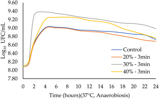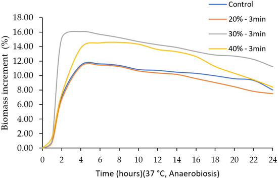 Similar results were found by Dahroud et al. (2016), who studied the effect of time (15, 30, and 45 sec) and amplitude (20, 40, and 60%) during the fermentation process of Lactobacillus casei subsp. casei, reporting that the highest biomass production occurred when using 60% amplitude for 15 s of ultrasonic treatment and that the duration of the logarithmic phase and the growth rate were increased by applying ultrasound [16]. Likewise, other authors have reported the reduction or elimination of the lag phase of the growth curve of LAB in milk without changing or influencing the total fermentation time [31,32].