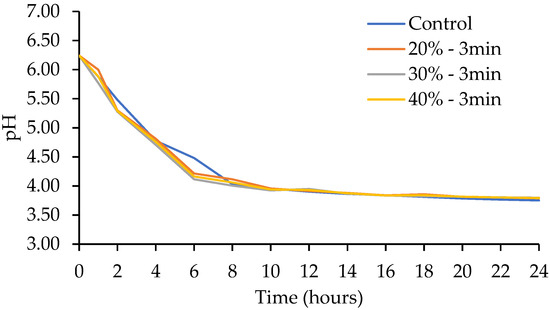 Since there were no differences in the lag values when ultrasound was applied for 60 and 90 s, a previous experiment was conducted increasing time to 3 min and 5 min at an amplitude of 30 and 60%, based on what was reported in other studies [16,30]. The use of 3 min and 30% of amplitude presented the largest counts of LA-5. In this part of the experiment, ultrasound was applied for 3 min, varying the amplitude to 20, 30, and 40%. Kinetic growth parameters are shown in Table 4 and in the growth curve in Figure 5. Regarding the parameter yo, which corresponds to the initial point of the sigmoidal curve, no significant differences were observed among treatments (p > 0.05); this was expected, since the same inoculum was used for all treatments. For Tmax, variations were found among treatments (p < 0.05), being greater for 40% amplitude for 3 min of ultrasound application (2.985 ± 0.031) and smaller for 30% amplitude for 3 min of ultrasound application (1.998 ± 0.000). For the lag phase, significant differences were also observed between treatments (p < 0.05), being greater at 30% amplitude for 3 min of ultrasound application (0.923 ± 0.000) and smaller at 40% amplitude for 3 min of ultrasound application (0.748 ± 0.000). In rate (µmax), variations were found between treatments (p < 0.05), being smaller at 40% amplitude for 3 min of ultrasound application (0.475 ± 0.007) and greater at 30% amplitude for 3 min of ultrasound application (1.065 ± 0.000). Finally, the regression adjustment coefficient (R2) presented values between 0.91 and 0.96. No differences were found in pH at the beginning and at the end of fermentation (p > 0.05) (Figure 6). Likewise, and in accordance with the kinetic parameters, the highest biomass production was observed when ultrasound was applied at 30% amplitude for 3 min (Figure 7).