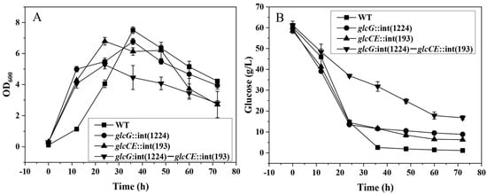 The mutant C. acetobutylicum glcG::int(1224) cultured in minimal medium with 60 g/L glucose exhibited similar growth phenotypes; however, the glucose consumption was reduced by ~17% compared to wild type (Figure 1), which led to an ~25% reduction in butanol production (Figure S3A,B). Under the same conditions, wild type and the mutant glcG::int(1224) achieved steady-state growth during acidogenic and solventogenic growth in the continuous fermentation (Figure 2). The optical density of the wild type was almost identical to that observed for the mutant glcG::int(1224) during acidogenic and solventogenic growth.