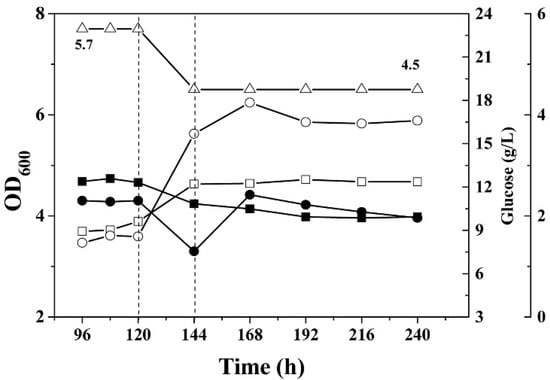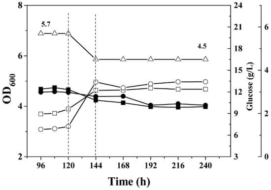 The mutant C. acetobutylicum glcG::int(1224)-glcCE::int(193) was grown in a fermenter with 0.75 L minimal medium as the working volume, and then the pH was set to 5.7. After overnight cultivation, the OD600 of the culture achieved 4.5, and then continuous fermentation started with phosphate-limited minimal medium at the dilution rate of 0.075 h−1. The growth result demonstrated that the mutant glcG::int(1224)-glcCE::int(193) was unable to achieve steady-state growth during continuous fermentation (Figure 5).