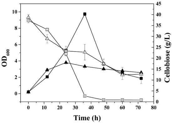 Batch fermentations were performed in minimal medium at 37 °C using 50 g/L glucose or cellobiose as the carbon source. Two independent cultivations were performed for each strain (wild type or mutants), and the average value of the OD600 was used for the growth curve. The minimal medium was prepared as described previously in 1 L distilled water containing the following ingredients: glucose, 50 g; (NH4)2SO4, 2 g; KH2PO4, 1 g; K2HPO4, 1 g; MgSO4·7H2O, 0.1 g; NaCl, 0.01 g; NaMoO4·2H2O, 0.01 g; CaCl2·2H2O, 0.01 g; MnSO4·H2O, 0.015 g; FeSO4·7H2O, 0.015 g; biotin, 0.1 mg; thiamine hydrochloride, 2 mg; and p-aminobenzoic acid, 2 mg [].