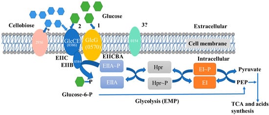 Bioinformatic analysis of the genome sequence of C. acetobutylicum ATCC 824, which was published in 2001, identified 13 putative PTS EII enzymes in this strain [,]. Although the family of these 13 putative PTS EII domains were assigned by phylogenetic analysis and the probable substrates were inferred, a considerable amount of functional characters were still required. For glucose uptake, it was predicted that the glcG gene (CAC0570) coded for a glucose transporter in C. acetobutylicum. However, after glcG was inactivated, the mutant fermented glucose as efficiently as the parent strain in a batch culture [,]. This result suggested that an additional glucose transporter exists in this organism.
