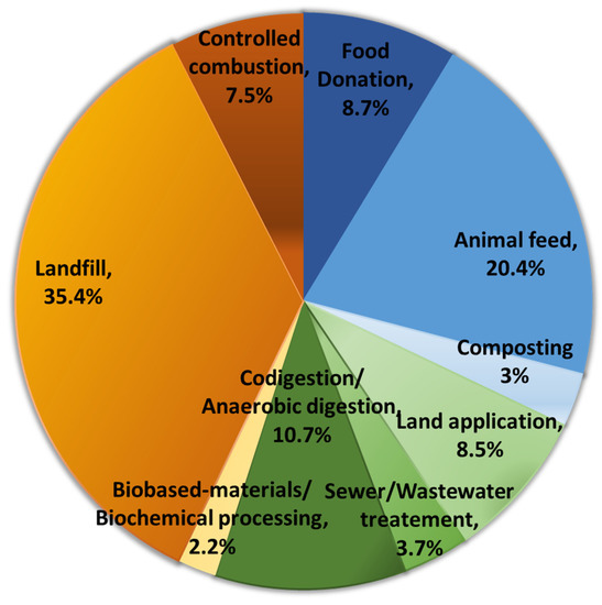 The conventional methods of valorizing and recycling food waste had been to produce biogas via anaerobic digestion, recover energy by combustion, use in animal feed, or use for composting. Figure 1 shows the percentage distribution of the food waste toward different applications in) USA. Undeniably, these conventional methods had been peddled socially, economically and environmentally, but the conventional methods suffer several setbacks due to longer time intervals for energy generation (anaerobic digestion), intensive capital, energy inputs, persistent organic pollutant (POPs) production (combustion), propensity to harbor pathogenic microbes (animal feed), unpleasant odor, and GHGs production (composting) [25,26,27]. According to a study, 95% of the total generated food waste is directed toward the landfills sites, releasing 3.3 billion tons of CO2 per year, making it the third top greenhouse gases (GHG) emitter after the USA and China [22,28]. In the USA, it was the second largest category of the municipal solid waste (MSW) collected in the year 2015 [29]. The large amount of FLW generated usually ends up at the landfill sites, which creates challenges viz. waste management, pollution and economic loss. The sea food waste comprising viscera, fins, scale, bones, etc. can produce bad odors and biogenic amine that pollutes coastal and marine environments impacting the coastal, sea and coral life [30].