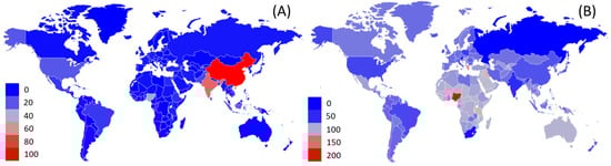 The estimates from different countries for (A) Household food waste estimate (MMT/year) and (B) Household food waste estimate (kg/capita/year). The countries with high estimates [Source: [36]].