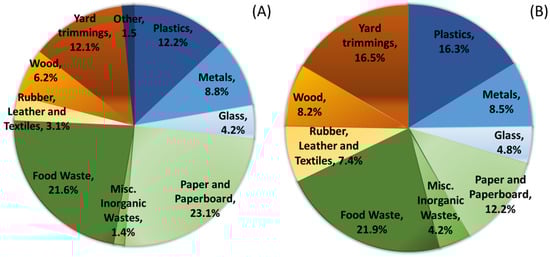 (A) The percentage distribution of USA MSW composition, 2018 (265.53 MM tons), and (B) The percentage distribution of energy recovery by combustion in U.S.A. (33.7 MM tons) [65].